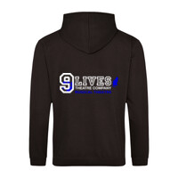 Nine Lives Theatre Company Adult Hoodie printed with Nine Lives logo and class.