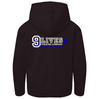 Nine Lives Theatre Company Adult Hoodie printed with Nine Lives logo and class.